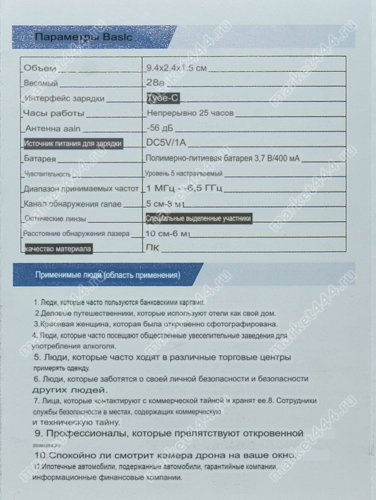 4. Возможные места для использования прибора: Ванные, раздевалки, казино, квартиры, помещения для проведения важных переговоров, экзаменов, семинаров, транспортные средства.