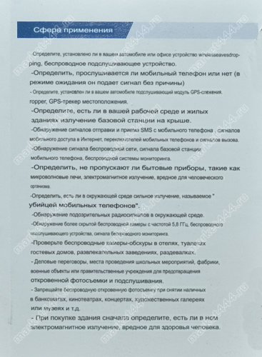 2. Технические возможности: поиск скрытых шпионских мини видео камер, GSM, WIFI прослушки, радио жучков; сигналов и магнитного поля GPS трекеров слежения.